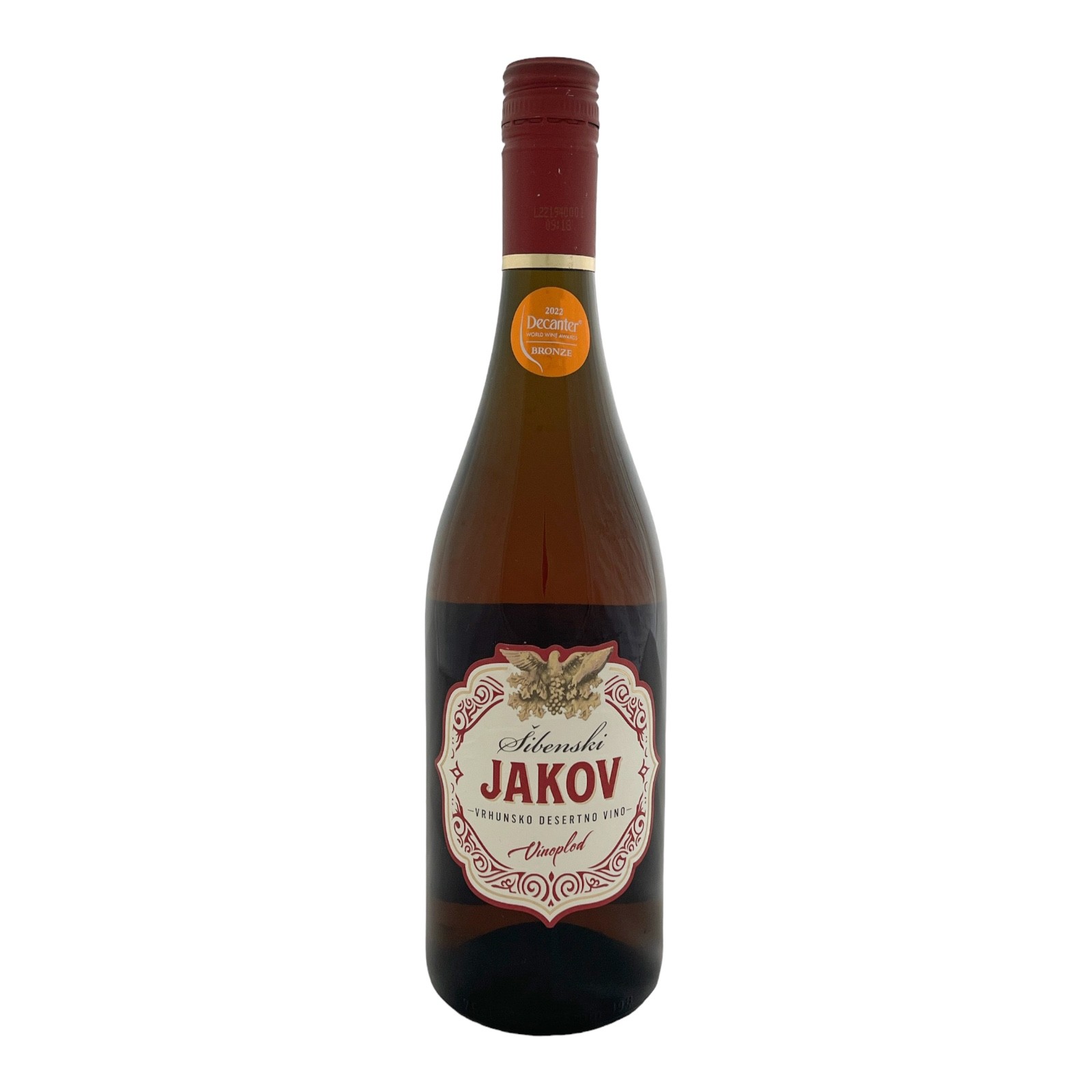 Jakov is de Prošek van Vinoplod uit Šibenik en de meest gelauwerde dessertwijn van Kroatië, diep geworteld in de Dalmatische traditie. Gemaakt van de inheemse witte druiven Debit, Maraština en Trbljan, waarbij geconcentreerde most wordt gefermenteerd tot een rijke, zoete wijn van grote diepgang. In het glas een donkere, amberkleurige tint. Het aroma is weelderig: rozijnen, walnoten, vijgen en abrikozen wisselen elkaar af in een harmonieus geheel. Ondanks 110 g/l restsuiker draagt de wijn fraaie zuren die de zoetheid in balans houden. Het mondgevoel is vol en licht olieachtig; de afdronk lang en verwarmend. Jakov is ideaal bij zoete desserts, chocolade of koekjes, maar even verrassend bij visschotels en paté. Een elegant alternatief voor portliefhebbers. Na opening nog één tot twee jaar houdbaar. Serveer gekoeld op 10 graden.